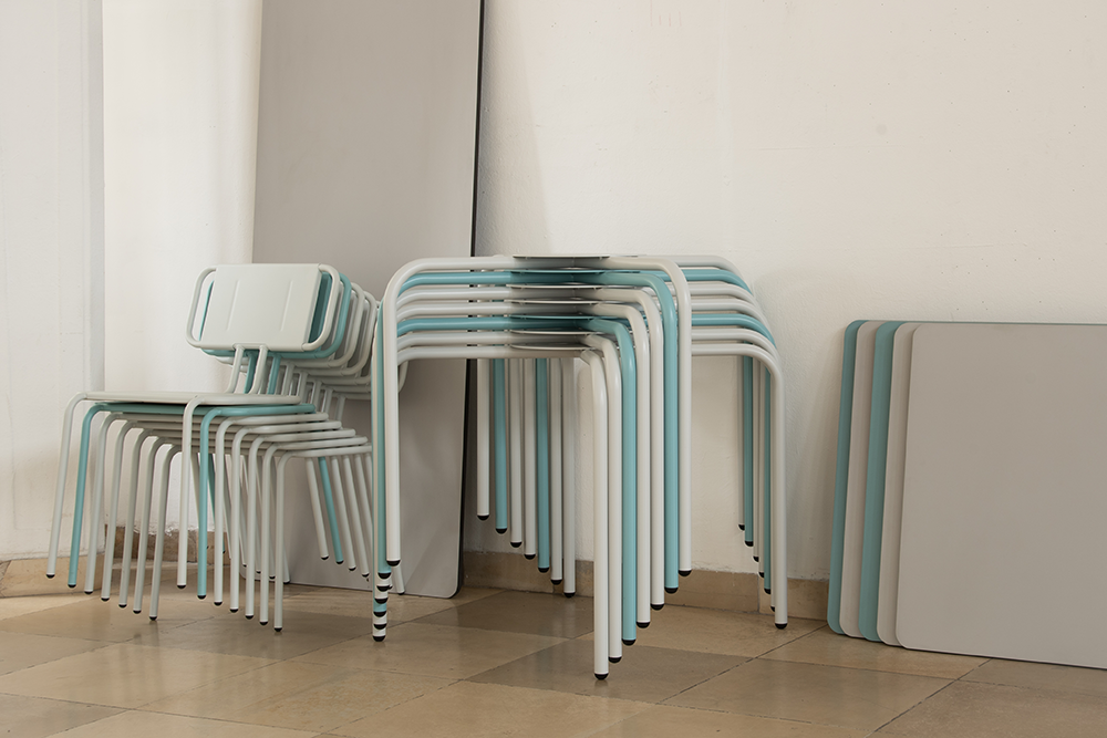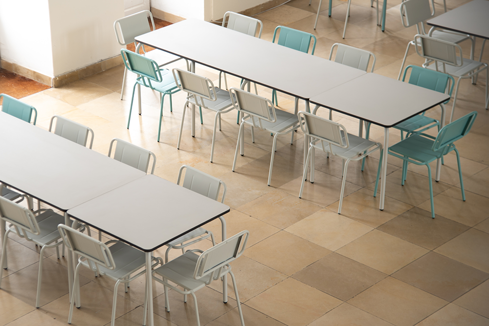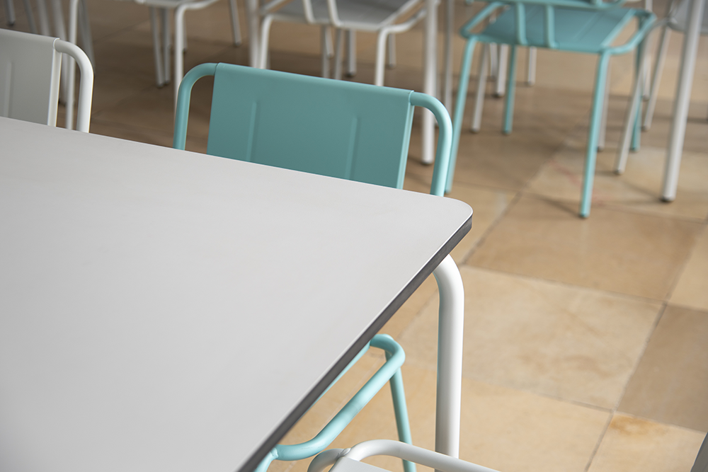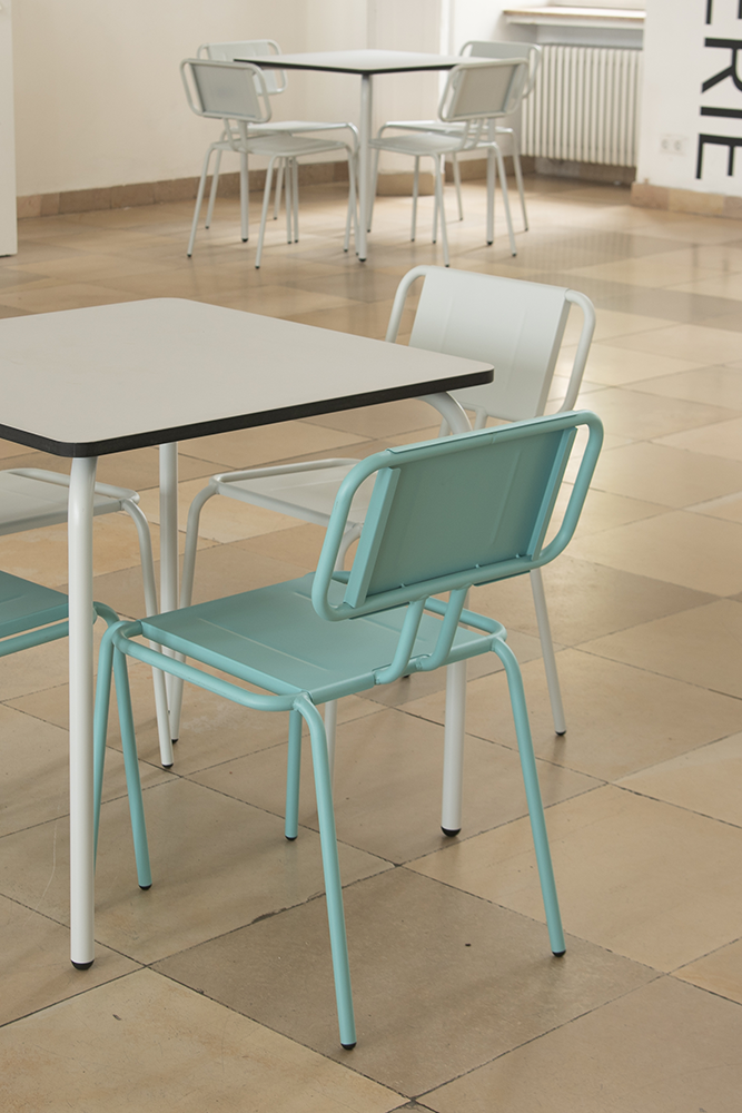 We are very happy that the HBKSaar foyer has finally got new furniture! The tables designed by Eva Ciesla are complemented by HAMA chairs in light gray and turquoise. The project was realized in cooperation with Echtstahl.