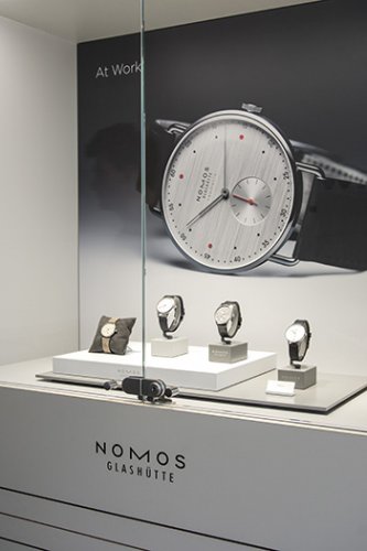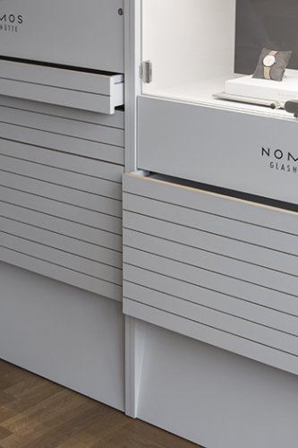 NOMOS Shop System This modular system of counters, showcases and displays adapts to any kind of exhibition context and presents the NOMOS watches in the best way. Producer: NOMOS Project assistant: Cosima Geyer, Bernadette Wüchner Photo Credits: Studio Mark Braun